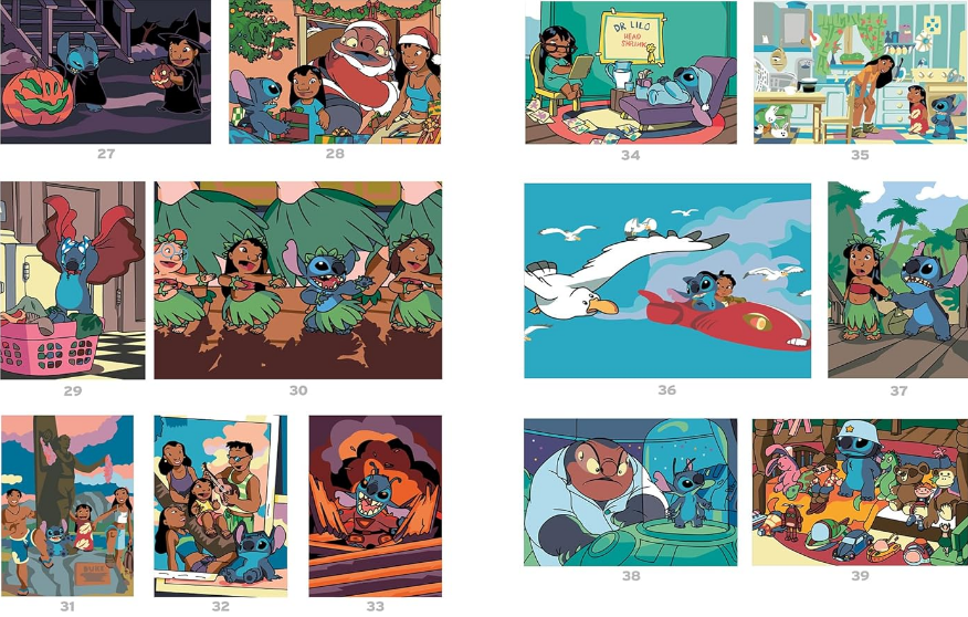 Colorie les cases en suivant les codes couleurs et découvre des scènes légendaires ! Alors, prêt à rejoindre Lilo et Stitch sous le soleil d'Hawaï ?