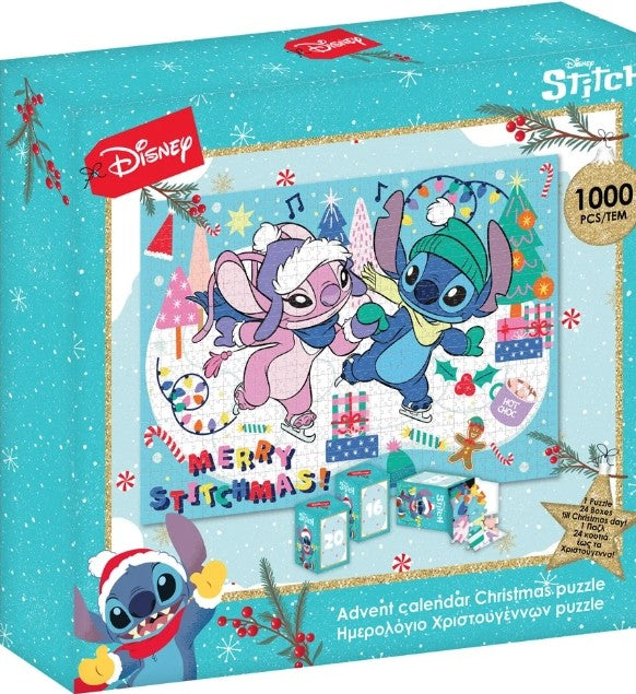 Préparez-vous à une saison des fêtes magique avec le calendrier de l'Avent Stitch, contenant un puzzle de 1000 pièces (50cm x 70cm)