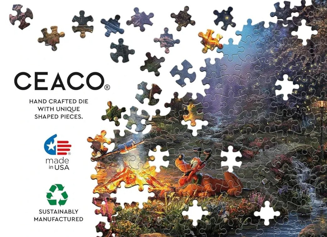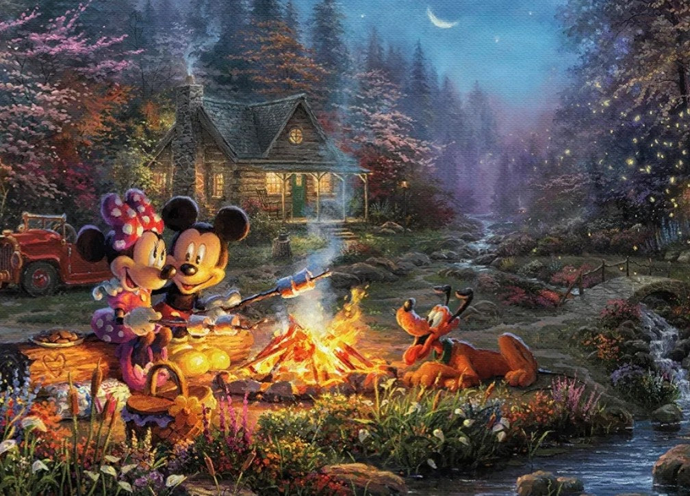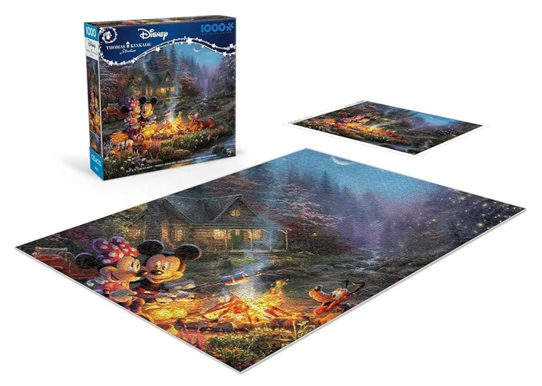 Découvrez ce puzzle Disney Ceaco Mickey et Minnie Sweetheart Campfire par Thomas Kinkade directement importé des États-Unis